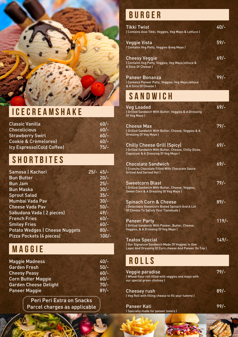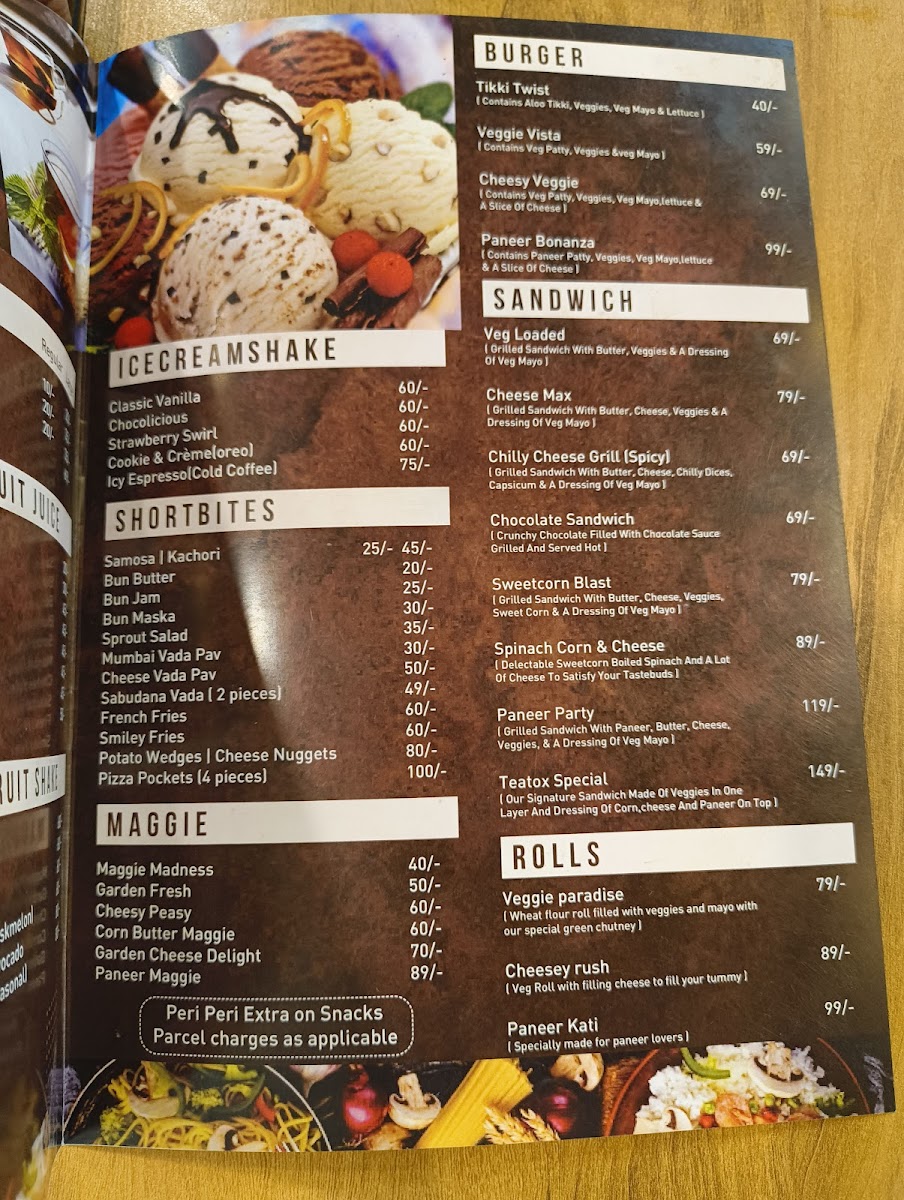 - Kathi Rolls: Explore flavors with the Paneer Kathi Roll and Veggie Paradise Roll, both wrapped in soft flatbreads.